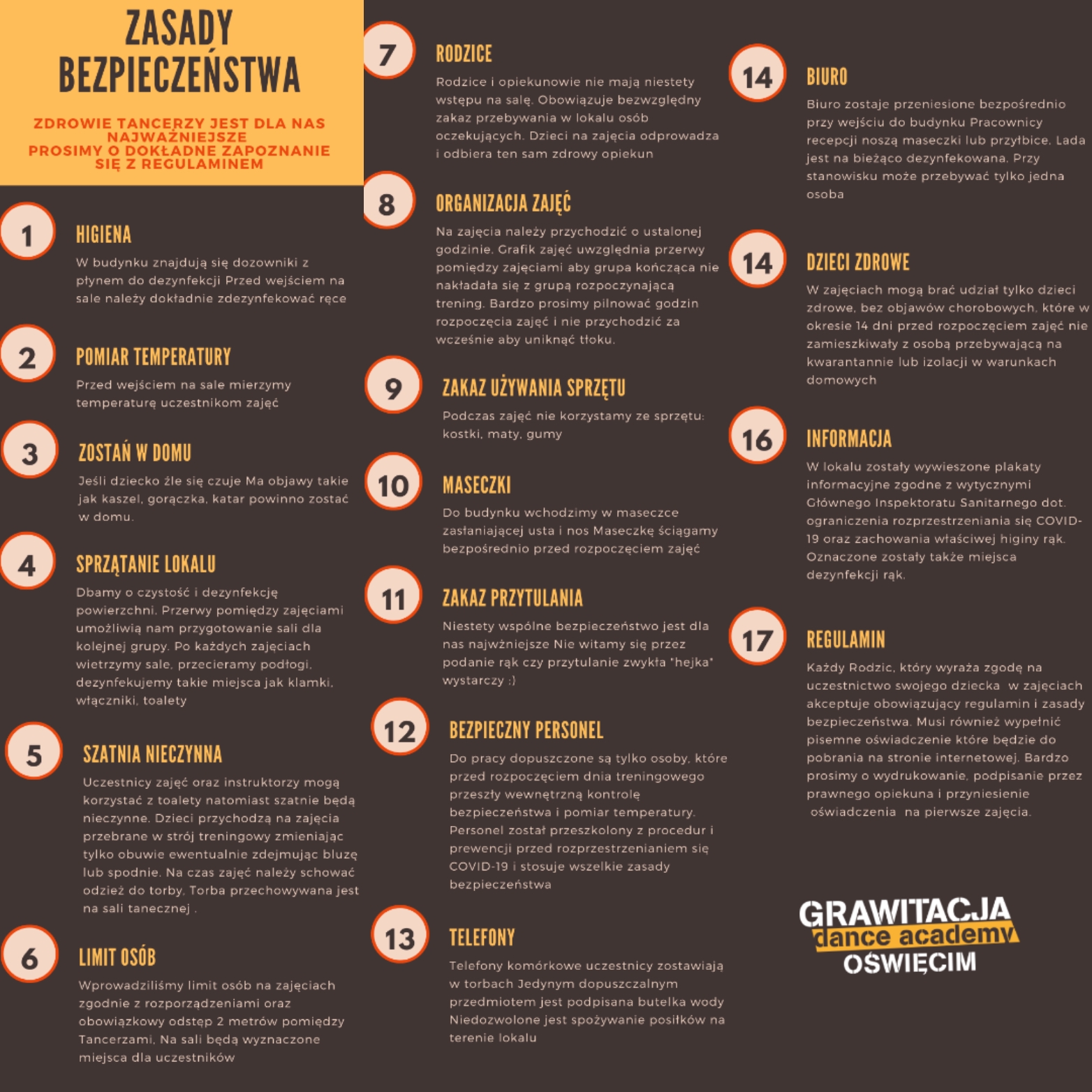 dezynfekcja rąk, odpowiednia ilość osób na sali, odpowiednie odległości w trakcie treningu, bezkolizyjny grafik, wejście do budynku w maseczkach, zakaz przebywania na terenie budynku osób niećwiczących